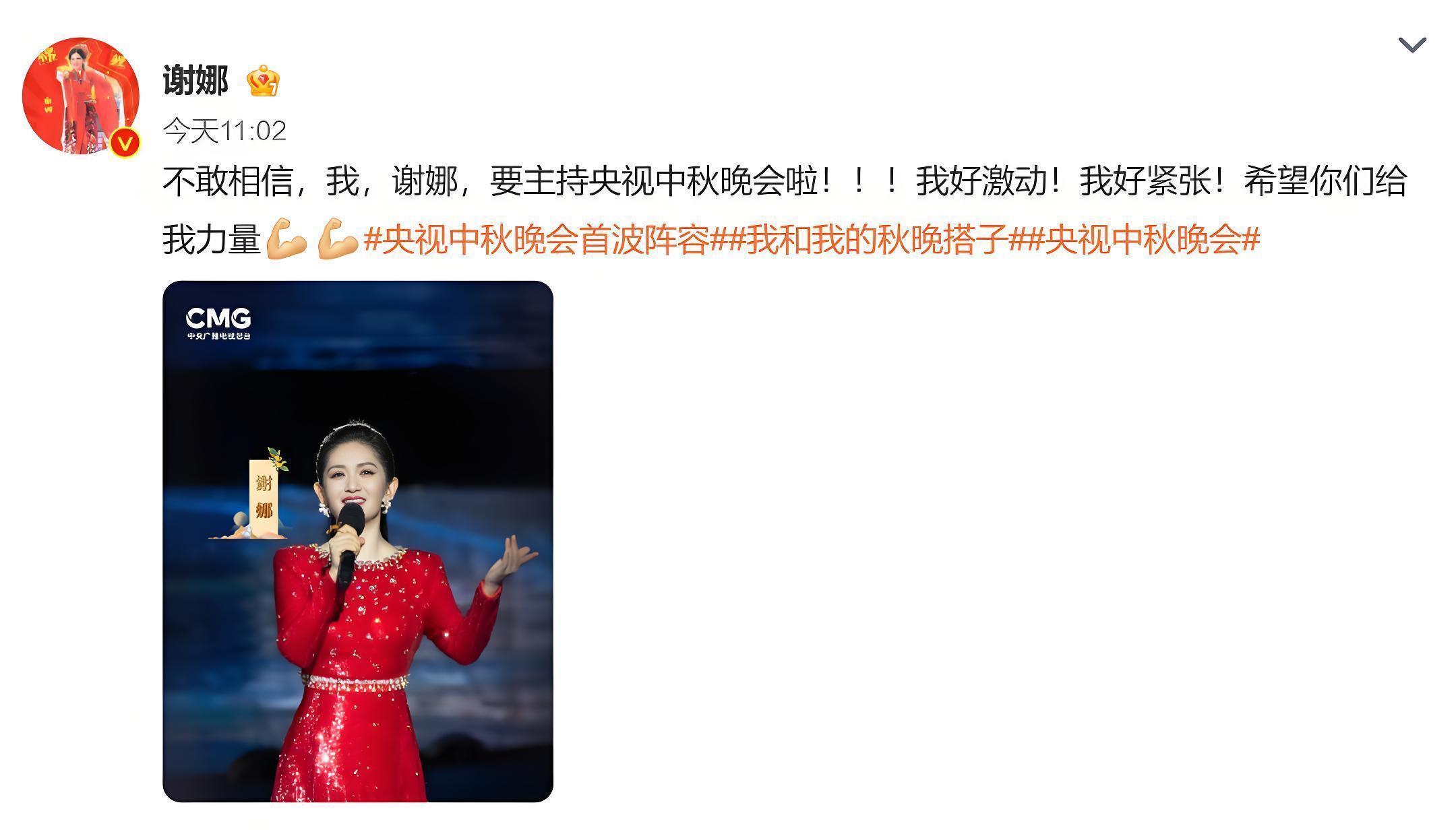 其中,谢娜此次是首次以主持人身份登上央视中秋晚会舞台,她于10月4日通过个人社交平台分享这一消息,字里行间难掩激动与紧张:“不敢相信,我,谢娜,要主持央视中秋晚会啦!!!我好激动!我好紧张!希望你们给我力量。”